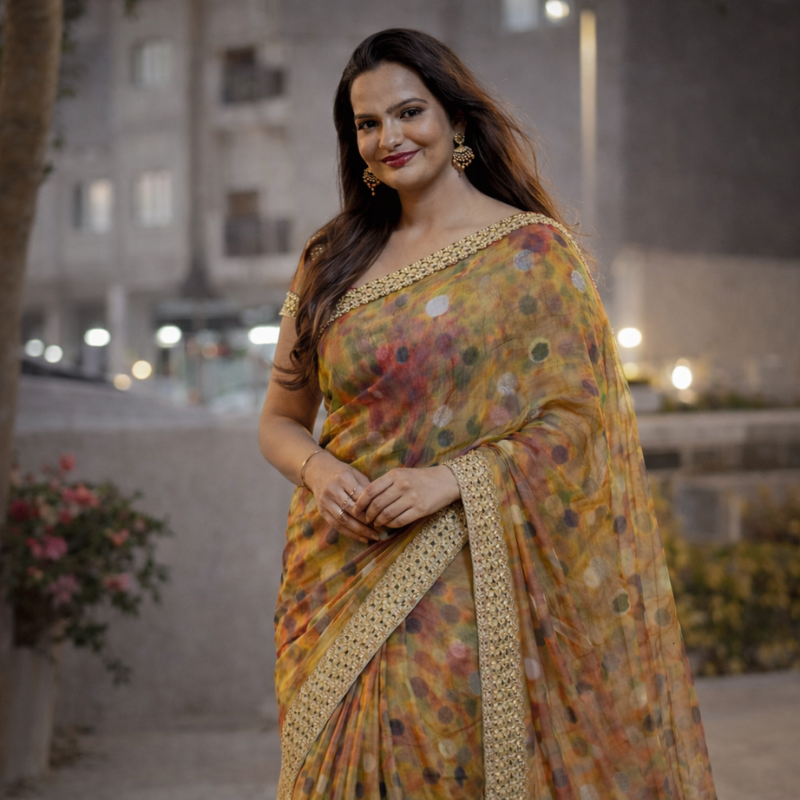 Celebrate effortless elegance with the Amber Bloom Printed Saree from Madonna Threads. Designed in a warm amber-gold palette with delicate multicolor abstract prints, this saree offers a perfect balance of tradition and modern charm.