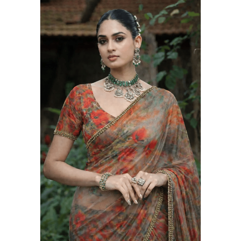 Sheer floral saree in warm earthy tones with a delicate gold border—lightweight, elegant, and perfect for festive and evening wear.