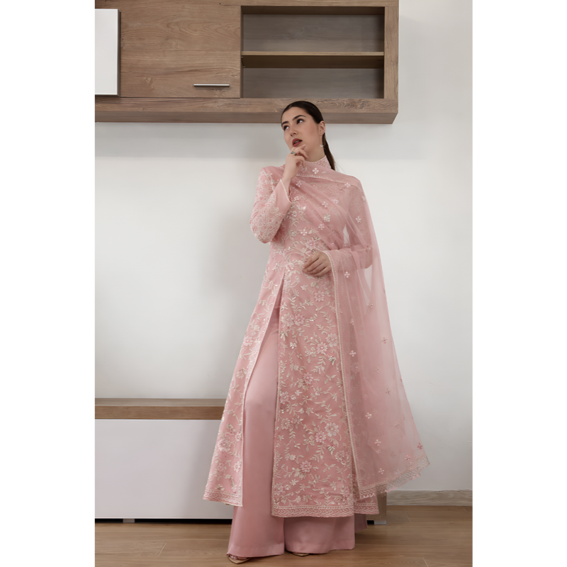 A soft pink embroidered kurta set paired with flowy palazzo pants and a sheer dupatta. Elegant, feminine, and perfect for festive gatherings.
