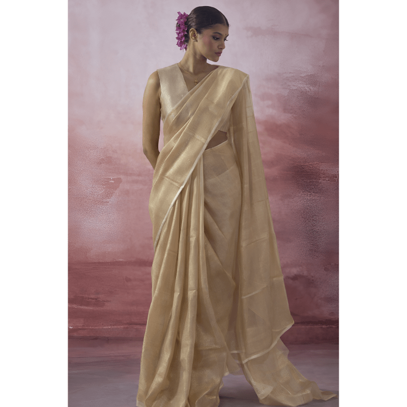 A soft gold saree with a delicate sheen and effortless drape, perfect for elegant festive and special occasions.