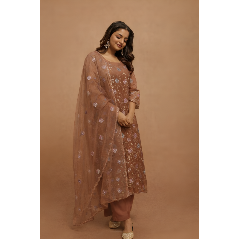 A graceful three-piece ensemble in a warm copper tone. It features a floral-embroidered kurta with intricate sequin work, paired with matching solid trousers and a sheer organza dupatta with delicate floral motifs.