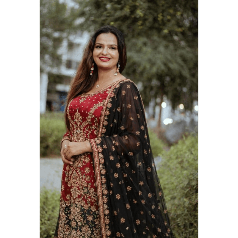 Rich red embroidered salwar suit paired with a sheer black dupatta featuring delicate gold detailing—perfect for festive and special occasions.