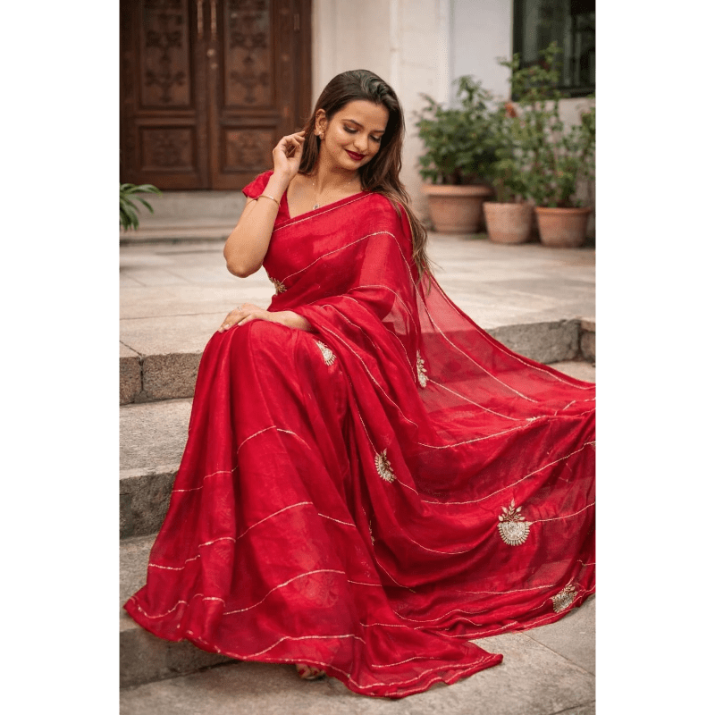 A rich red saree with delicate golden lines and subtle motifs, flowing effortlessly with elegance—perfect for festive evenings and special celebrations. ✨