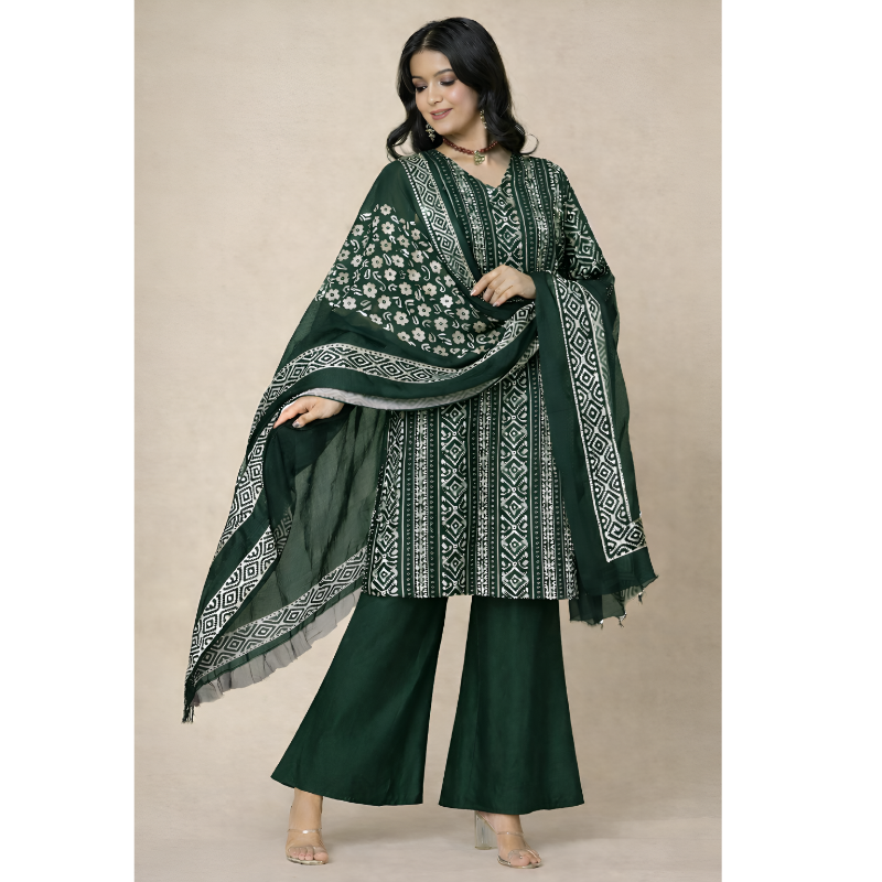 A rich emerald green kurta set featuring intricate geometric prints and a statement dupatta. Elegant, bold, and perfect for festive evenings or special occasions.