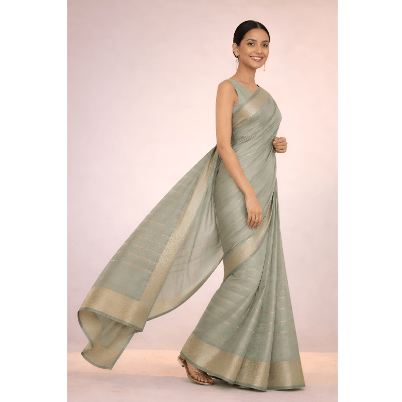 A soft sage-green saree with subtle gold accents and a fluid drape, perfect for elegant daytime and festive occasions.