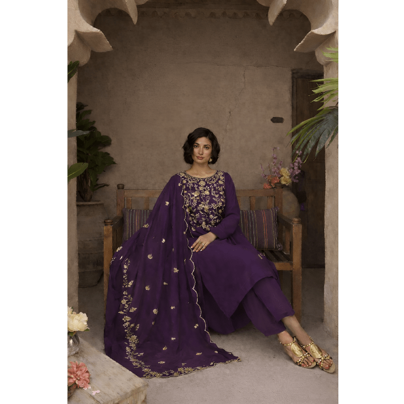 A rich purple kurta set adorned with intricate gold floral embroidery and a flowing dupatta, perfect for regal festive and evening occasions.