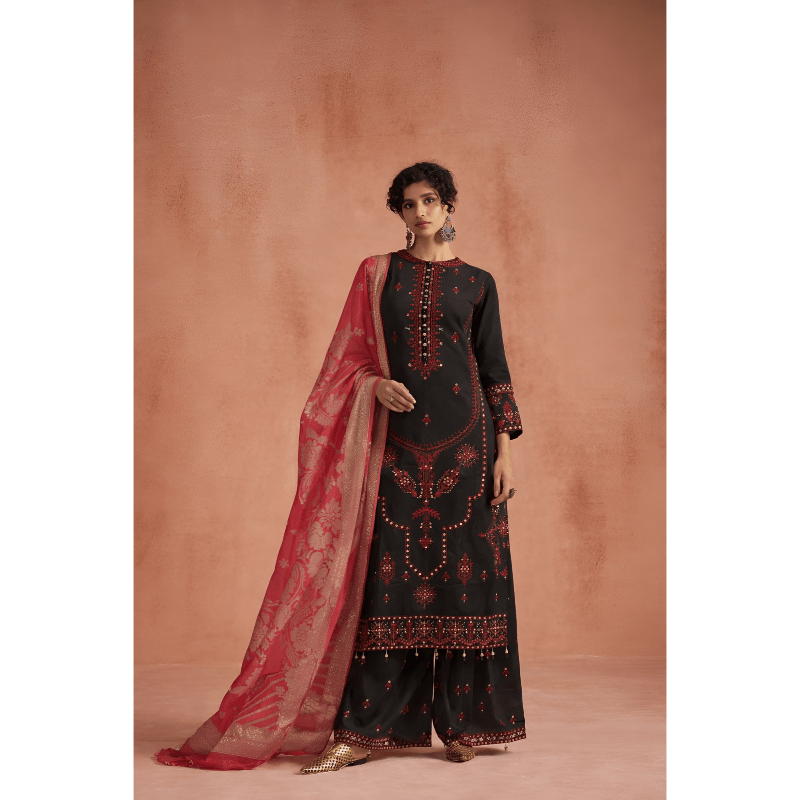 A striking black kurta set with rich red embroidery and a contrasting dupatta, perfect for bold festive elegance.