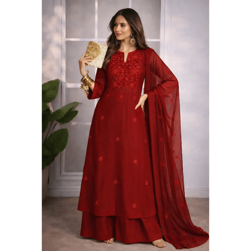 A rich red Anarkali adorned with subtle embroidery and a flowing sheer dupatta, crafted for timeless festive and wedding elegance.