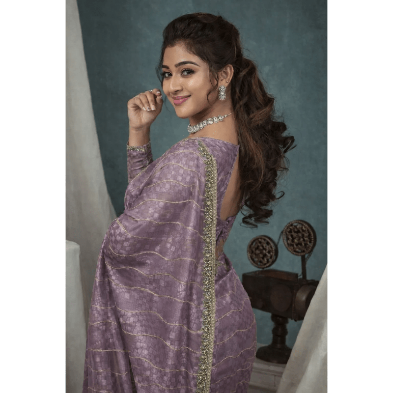 Soft lavender tissue saree with subtle zari stripes and a delicate gold border—perfect for festive and wedding wear.