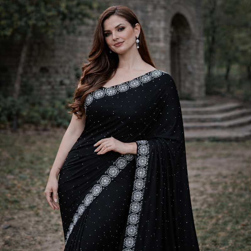 Exude timeless sophistication with the Midnight Empress Embellished Saree from Madonna Threads. Crafted in a deep black hue, this saree is accentuated with delicate silver-toned motifs and a refined embroidered border that adds subtle sparkle without overpowering the look.