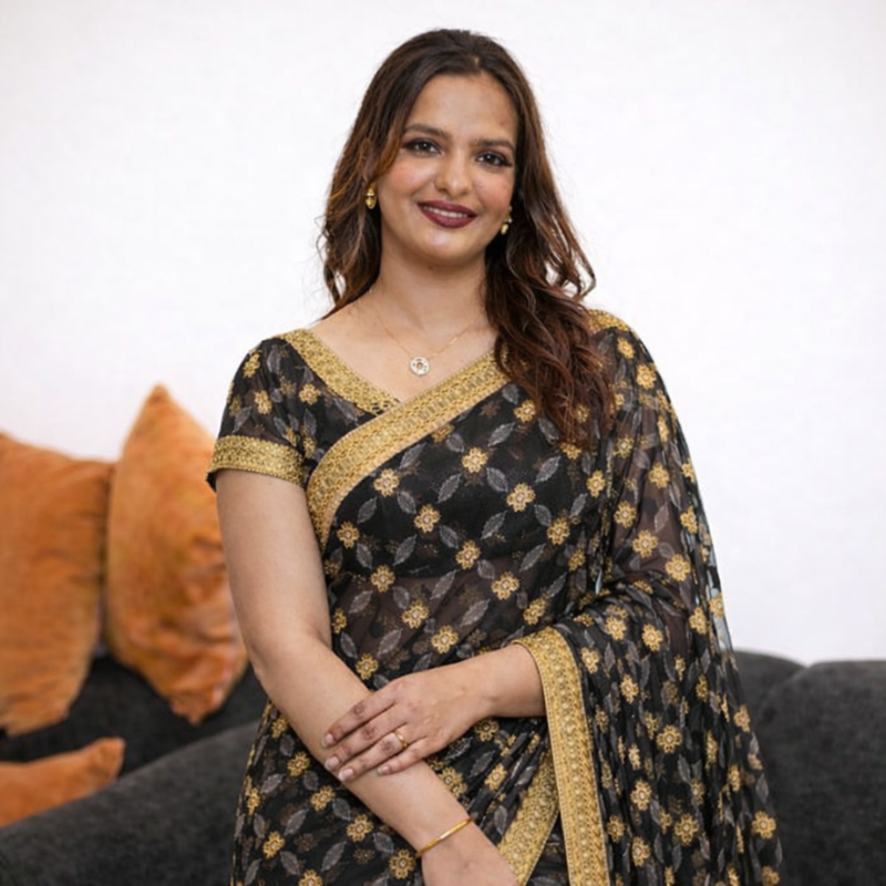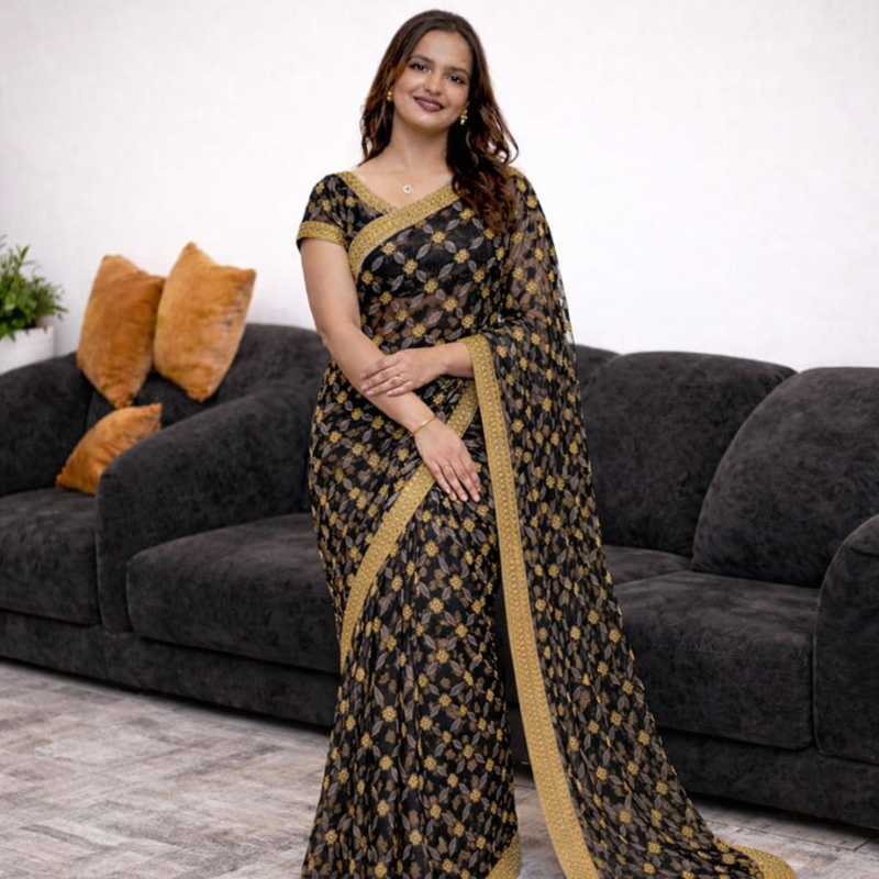 Grace meets subtle glamour in the Noir Gold Leaf Saree from Madonna Threads. Designed on a rich black base, this saree features delicate gold leaf-inspired motifs complemented by a refined gold-toned border that adds a touch of understated luxury.