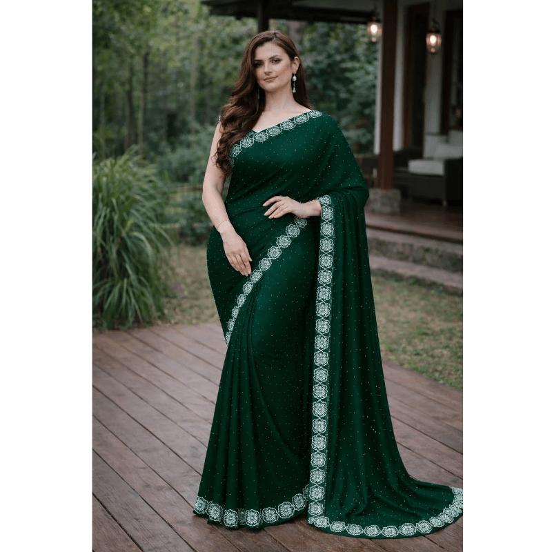 A lush deep-green saree highlighted with subtle shimmer dots and a refined silver floral border, evoking calm elegance and understated luxury—perfect for evening occasions and graceful festivities.