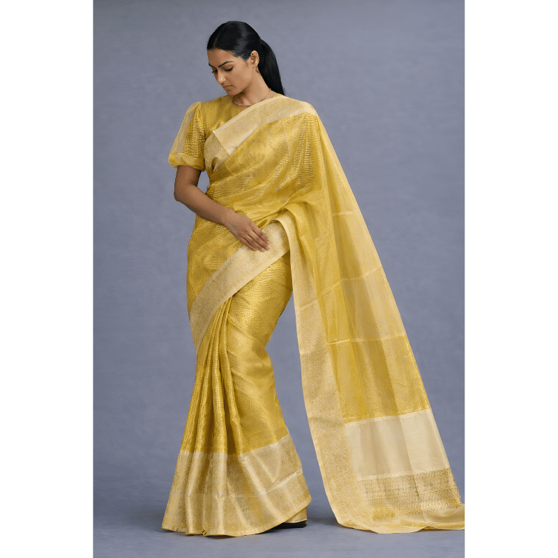 A radiant yellow-gold saree with a soft woven sheen and graceful drape, perfect for festive mornings and elegant celebrations.
