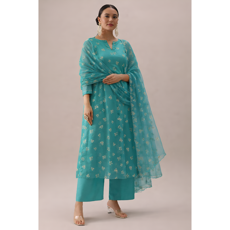 An elegant three-piece ensemble featuring a gold-embroidered straight kurta, matching wide-leg trousers, and a delicate scalloped organza dupatta.